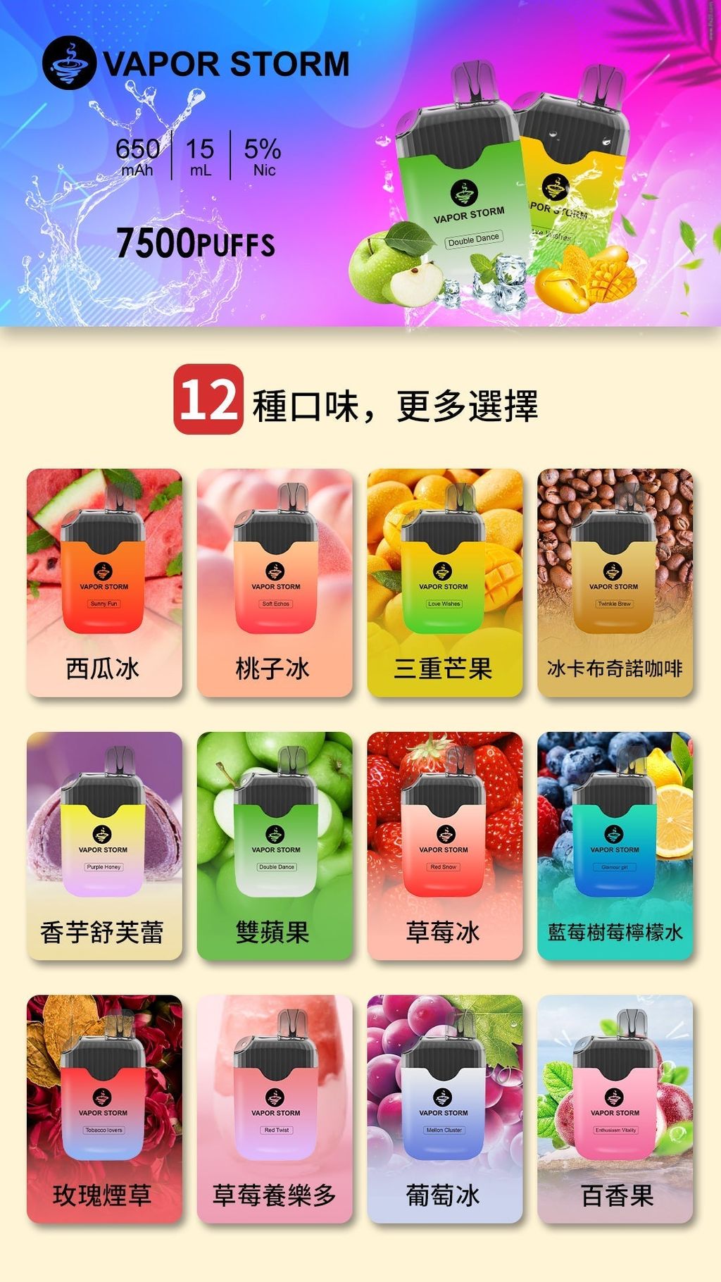 【VAPOR STORM 風暴】風暴一次性拋棄式電子菸 7500口 5%含量尼古丁 🍬台灣現貨